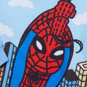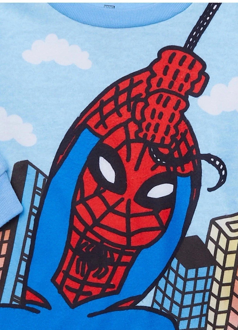 Este producto es un conjunto de pijama Spider-Man talla 12M hecho de vellón resistente al fuego, con cierre de jersey y mangas largas. El conjunto incluye una camisa de cuello redondo con un estampado gráfico de Spiderman en colores rojo y azul, y pantalones a juego. Diseñado para niños, este conjunto de ropa de dormir de dos piezas es perfecto para las temporadas de otoño e invierno, proporcionando un ajuste suave y acogedor para la hora de acostarse.