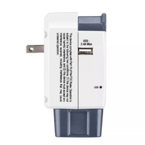 Adaptador de viaje internacional todo en uno con 3 tomas y puerto USB. Este accesorio de viaje le permite enchufar sus dispositivos electrónicos en enchufes que son diferentes al tipo utilizado en su país de origen. Los 3 tomacorrientes y el USB de 2.4 amperios cargan de manera segura la mayoría de las tabletas y teléfonos inteligentes, incluidos iPad y iPhone. Protección contra sobretensiones integrada para mantener sus aparatos eléctricos seguros. La luz de encendido indica cuando el adaptador está funcionando.