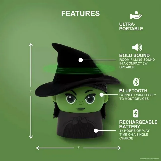 Sumérgete en la magia de la música con el altavoz Bluetooth portátil Bitty Boomers Elphaba. Inspirado en el icónico personaje de Wicked, este altavoz portátil ofrece una calidad de sonido impresionante en un diseño compacto. Ideal para fans de todas las edades, ofrece conectividad inalámbrica, batería recargable y la posibilidad de emparejarlo con otro Bitty Boomer para disfrutar de sonido estéreo.