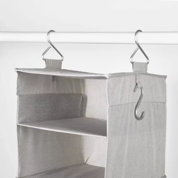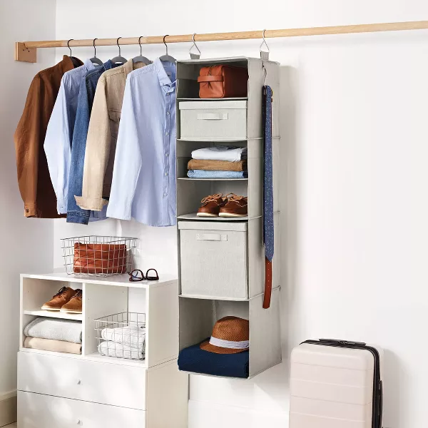 Mantener tu armario ordenado es mucho más fácil con el Organizador Colgante de Tela de Brightroom™. Perfecto para dormitorios, recibidores o armarios de ropa blanca, este organizador colgante cuenta con tres o seis estantes, además de un gancho para accesorios a cada lado que ofrece amplio espacio para guardar suéteres, toallas, mantas, zapatos y más. Su ancho de 35 cm permite que encaje fácilmente incluso en armarios pequeños, y su color gris claro lo hace fácil de combinar con casi cualquier paleta de colores.