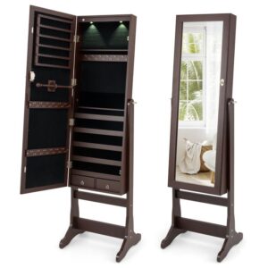 Con múltiples áreas de almacenamiento, el joyero puede ayudarte mejor a organizar tus joyas, cosméticos y otros objetos de valor. Y equipado con un espejo de cuerpo entero, el gabinete también puede usarse como espejo para vestirte. Y las luces LED internas te permiten usarlo en la oscuridad de la noche. Además, puedes elegir entre 4 ángulos de inclinación ajustables para lograr la vista perfecta de cuerpo entero en el espejo.