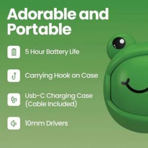 ¡Dale personalidad a tu música con los audífonos inalámbricos Frog Face True! Estos adorables audífonos ofrecen 5 horas de duración de batería e incluyen un gancho de transporte en el estuche para que puedas llevarlos fácilmente dondequiera que estés. Con los controles táctiles en los audífonos, administrar tu música nunca ha sido tan fácil. El estuche cuenta con 3 caras diferentes que puedes cambiar según tu estado de ánimo. ¡Solo gira el estuche para cambiar la cara!