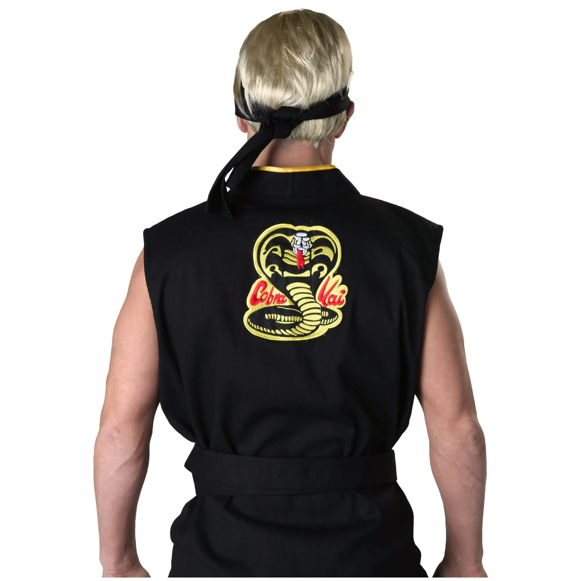 ¡Prepárate para canalizar tu maestro de dojo interior con nuestro disfraz de Karate Kid Cobra Kai! La camiseta de karate gi tiene el estilo de lo que el icónico chico malo Johnny Lawrence usó en Karate Kid, por lo que es un rico negro con bordes amarillos que cruza tu cuerpo. Cuenta con el logotipo de Cobra Kai en la parte posterior y insignias intercambiables que puedes usar en el pecho delantero. Los pantalones a juego tienen una cintura con cordón para un ajuste perfecto y cinco parches bordados en la pierna derecha.