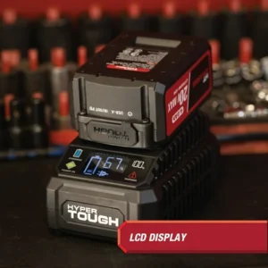 El cargador rápido Hyper Tough está diseñado para mantener sus herramientas cargadas y listas para la acción. Compatible con todas las baterías de iones de litio Hyper Tough de 20 V máx., este cargador rápido garantiza una carga rápida y eficiente, completando la carga en tan solo una hora. La pantalla LCD integrada muestra actualizaciones claras del estado de carga, para que pueda supervisar el progreso de un vistazo. Con un cable de alimentación de 1,8 metros, ofrece flexibilidad para cargar en diversos lugares, ya sea en su taller o en la obra. Con un peso de tan solo 320 g, este cargador ligero y compacto es fácil de transportar y guardar, lo que lo convierte en un accesorio esencial para sus herramientas eléctricas Hyper Tough.