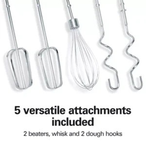 ACCESORIOS VERSÁTILES PARA BATIDORA DE PIE: Los 2 batidores tradicionales, un batidor de varillas y 2 ganchos para masa te permiten mezclar desde masa para pasteles y galletas hasta batir crema y amasar masa para pizza.