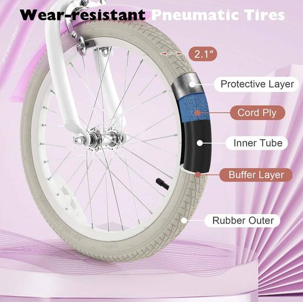 Nuestra linda bicicleta para niños de 18 pulgadas permitirá que tu pequeño disfrute montando. Esta bicicleta para niños está diseñada con un manillar ajustable de 30 a 32,5 pulgadas y una altura del asiento de 24 a 28 pulgadas, que es perfectamente adecuada para niños de 4 a 8 años o niños pequeños con 47 a 59 pulgadas de altura. Mientras tanto, 2 ruedas antideslizantes y amortiguadoras pueden moverse de forma segura y suave en superficies planas. Nuestro sillín acolchado hará que tus hijos se sientan cómodos al sentarse en él incluso después de un paseo prolongado.