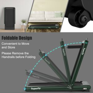 • Cinta de correr plegable: Pensando en tu comodidad, esta cinta de correr Superfit 2 en 1 con 2 ruedas integradas se pliega para que puedas transportarla y guardarla fácilmente, ahorrando espacio en casa. Retira las 2 asas antes de plegarla.