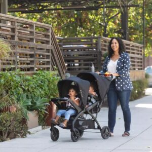 Las ruedas delanteras simples y aerodinámicas permiten un fácil empuje y un tamaño más compacto para el nuevo Sit N’ Stand Double 2.0. Sus dos pasearán con calidad, comodidad y estilo con este favorito rediseñado de las familias en crecimiento.