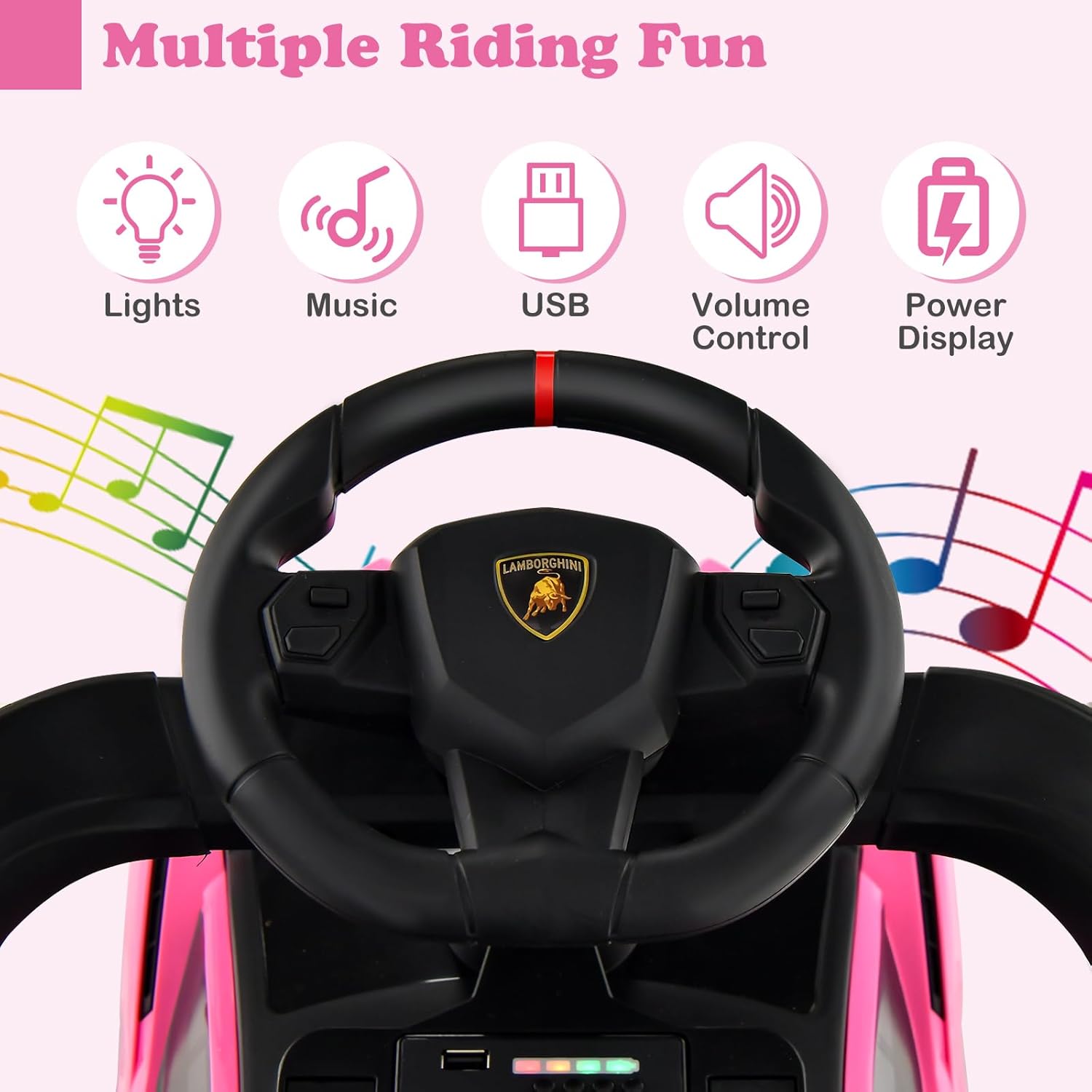 Múltiples funciones atractivas: El cochecito infantil incluye luces delanteras brillantes, luces de indicación de potencia, bocina y sonido de motor. La música integrada y la función USB permiten a los niños reproducir sus propias canciones e historias. Nota: La función de música y luces requiere 4 pilas AA de 1,5 V, no incluidas en el paquete.