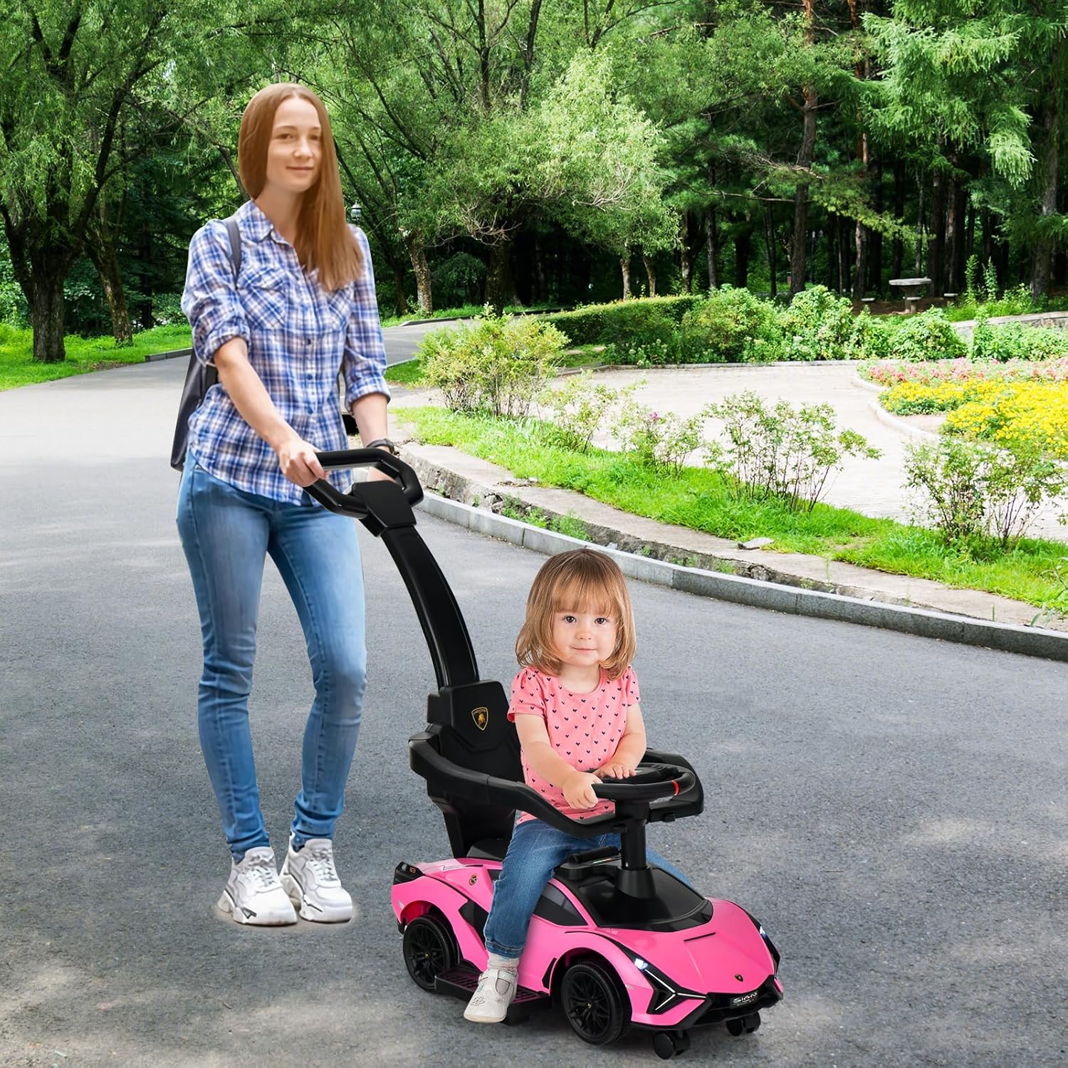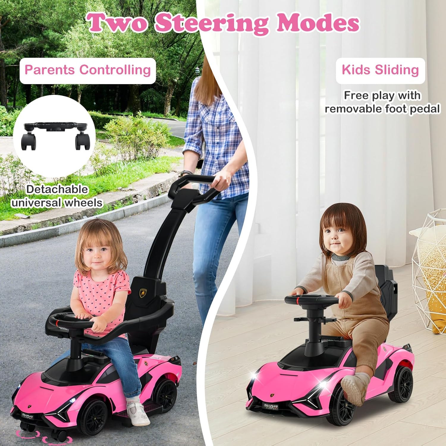 Dos modos de control: Gracias a sus dos ruedas universales desmontables, los padres pueden controlar fácilmente este cochecito infantil para niños pequeños. Además, los niños pueden manejarlo libremente para una divertida exploración gracias al volante giratorio.