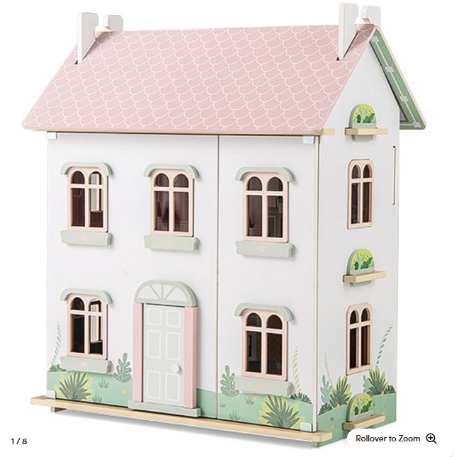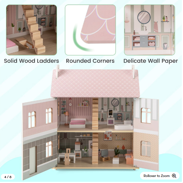 Casa de muñecas de 3 niveles con escenas de vida simuladas. Techos dobles convertibles y puertas que se abren.