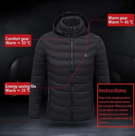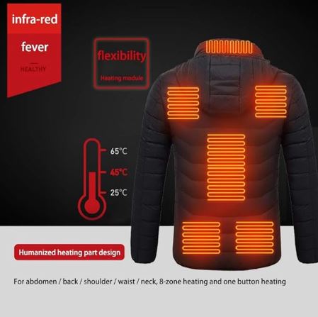 Esta chaqueta calefactable de 8 zonas ofrece calor uniforme en estómago, cuello, hombros, espalda y cintura, calentándose rápidamente incluso en climas extremos. Cuenta con tres niveles de temperatura ajustables (25 °C, 35 °C y 45 °C) para adaptarse a tus necesidades, brindando máxima comodidad en días fríos. Fabricada con algodón, poliéster y nailon impermeable, es resistente al agua y lavable gracias a su interfaz aislada. Funciona con bajo voltaje de 5V mediante cargador y utiliza tecnología de fibra de carbono con calefacción infrarroja segura y eficiente. Es la compañera ideal para actividades como esquiar, pescar, andar en motocicleta o simplemente enfrentar el invierno con estilo y protección.