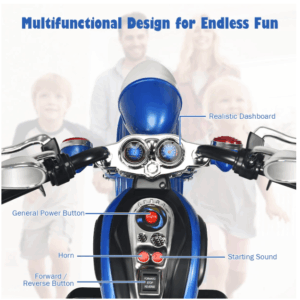 Atractivo diseño estilo chopper: Esta motocicleta estilo chopper atraerá a los niños a primera vista, con una apariencia realmente atractiva que la supera en rendimiento a otras motocicletas comunes. Además, su diseño de 3 ruedas con baja gravedad proporciona una experiencia de conducción estable que evita caídas. Además, el asiento infantil con respaldo eleva la comodidad al siguiente nivel.