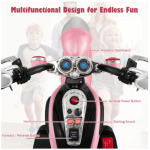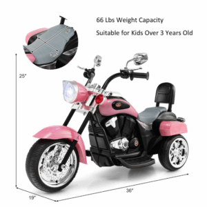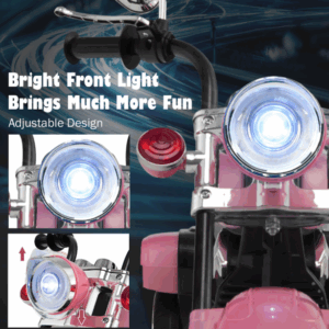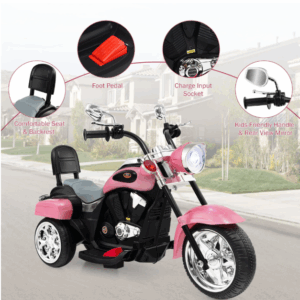 - Atractivo diseño estilo chopper: Esta motocicleta estilo chopper atraerá a los niños a primera vista, con una apariencia realmente atractiva que la supera en rendimiento a otras motocicletas comunes. Además, su diseño de 3 ruedas con baja gravedad proporciona una experiencia de conducción estable que evita caídas. Además, el asiento infantil con respaldo eleva la comodidad al siguiente nivel.