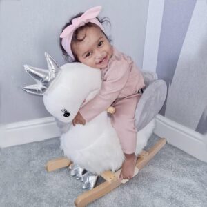 Información del caballito balancín de cisne: Dimensiones: 60 cm de largo x 33 cm de ancho x 59 cm de alto. Capacidad de peso: 40 kg. Edad recomendada: 18-36 meses.