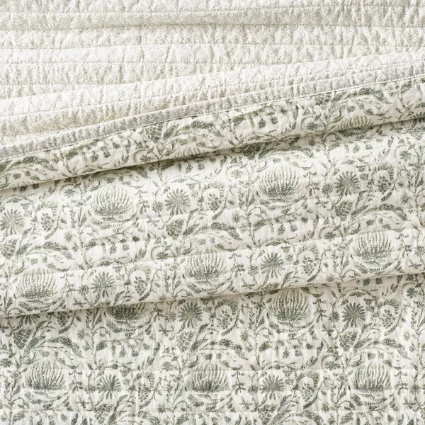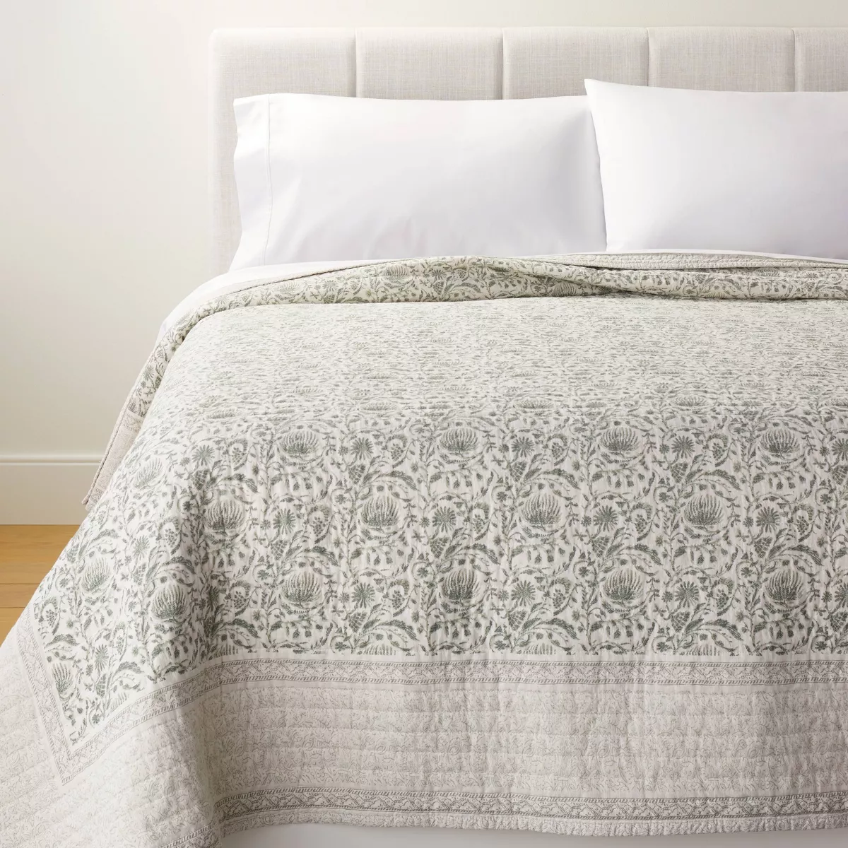 Decora y combina tu cama con esta colcha de algodón flameado con borde decorativo de Threshold™, diseñada en colaboración con Studio McGee. Esta colcha flameada color crema presenta un estampado botánico en verde azulado claro y un borde decorativo que le da un toque más atractivo. La tela de algodón de peso medio ofrece comodidad durante todo el año y es lavable a máquina para un cuidado fácil. Combínala con fundas y sábanas a juego para completar el conjunto.