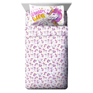 Déjate llevar por un sueño lleno de sueños con este divertido y colorido juego de cama JoJo Siwa Dream Unicorn. Este juego de cama está hecho 100 % de microfibra y presenta un unicornio de dibujos animados con temática de JoJo Siwa a juego en el edredón reversible, la sábana plana, la sábana ajustable y la funda de almohada incluidos.