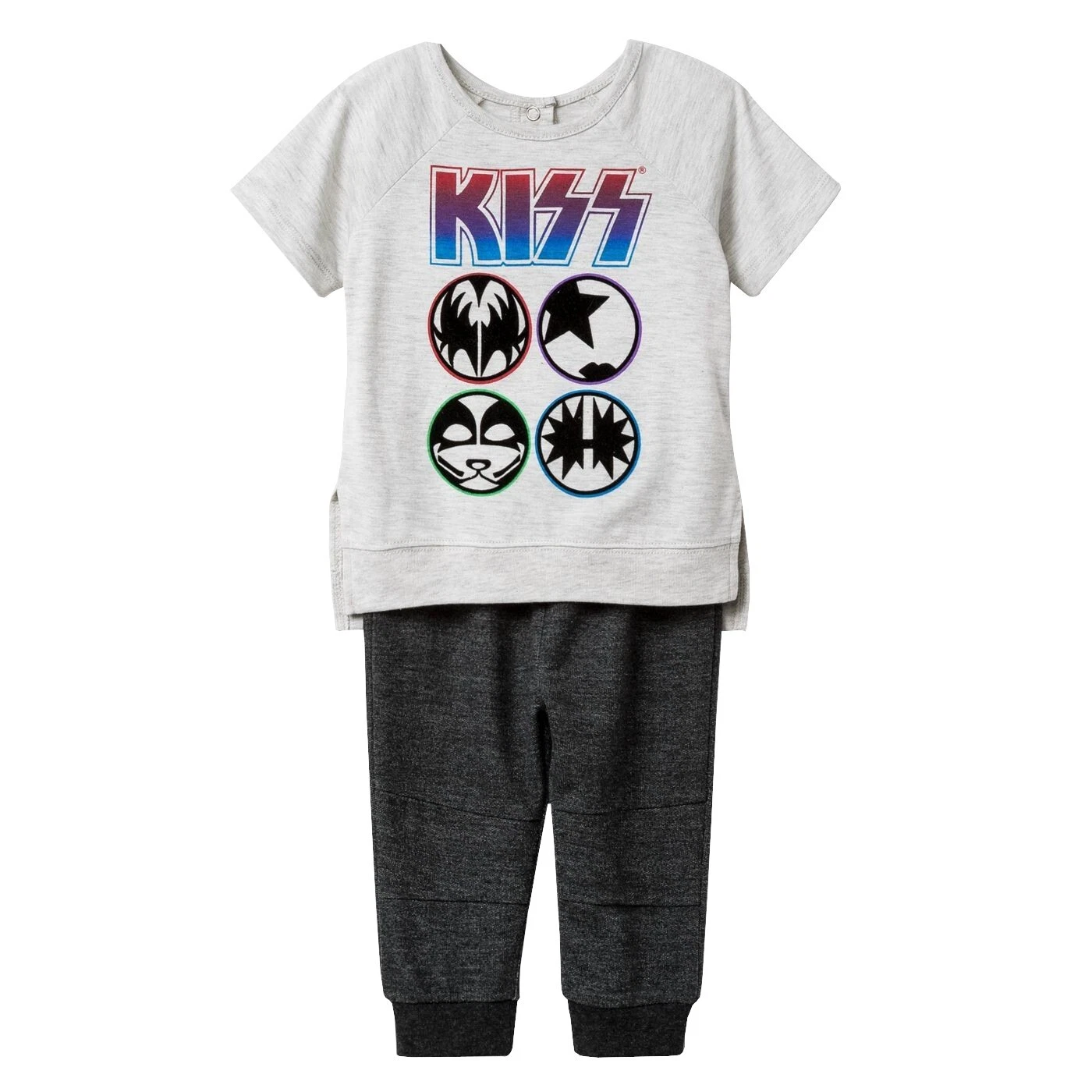 Descripción: Mantén a tu pequeño como un lindo balancín con el conjunto superior e inferior Kiss. Hecho de una tela suave y transpirable, este conjunto de ropa deportiva de dos piezas incluye una camiseta de jersey y pantalones de felpa francesa. La camiseta de manga corta en gris jaspeado claro se acentúa con el texto impreso del logotipo de KISS y las imágenes para un aspecto divertido inspirado en la banda de rock. Está terminado con un dobladillo con bandas acompañado de aberturas laterales para un adorable aspecto relajado, mientras que el cierre de botón a presión en la parte posterior hace que sea un poco más fácil vestir a tu hijo. Los pantalones de carbón macizo tienen una pretina elástica con un cierre de cordón para un ajuste ajustable y seguro y tienen tobillos tejidos acanalados para evitar que los pantalones se suban cuando se arrastra o aprende a caminar.