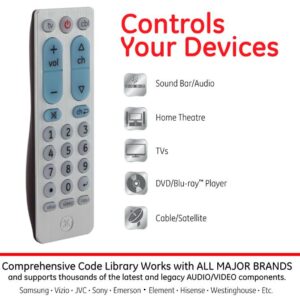 Consolide el control y elimine el desorden con un control remoto universal de 2 dispositivos GE. Perfecto para pequeñas configuraciones de entretenimiento, este práctico control remoto cuenta con un teclado grande y simplificado con botones fáciles de leer que le permiten controlar hasta dos dispositivos, incluido su televisor, barra de sonido, cable, satélite y más. El acabado plateado cepillado agrega un toque elegante a cualquier configuración de entretenimiento en el hogar, y el diseño ergonómico hace que sea cómodo de sostener y operar. Preprogramado para uso inmediato con televisores Samsung, la configuración de este control remoto es simple y fácil de usar con su elección de búsqueda automática de códigos o programación de ingreso directo de códigos. Optimice su entretenimiento en el hogar con el control remoto universal GE para 2 dispositivos.