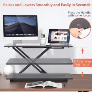 - Este convertidor de escritorio de pie viene montado. Simplemente abre y utiliza. El convertidor de escritorio de pie tiene un potente resorte de gas que hace que sea bastante fácil y seguro subir o bajar. Tiene una altura ajustable simplemente presionando la palanca lateral y suelta cuando llegue a la posición donde quieras.