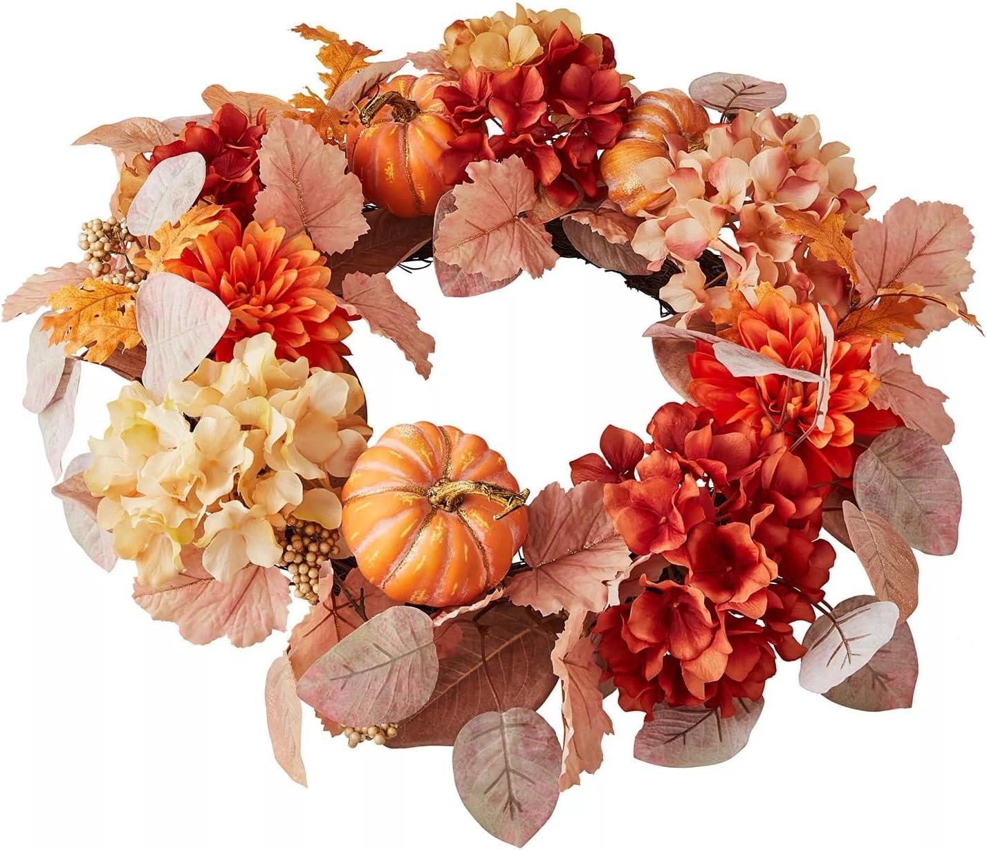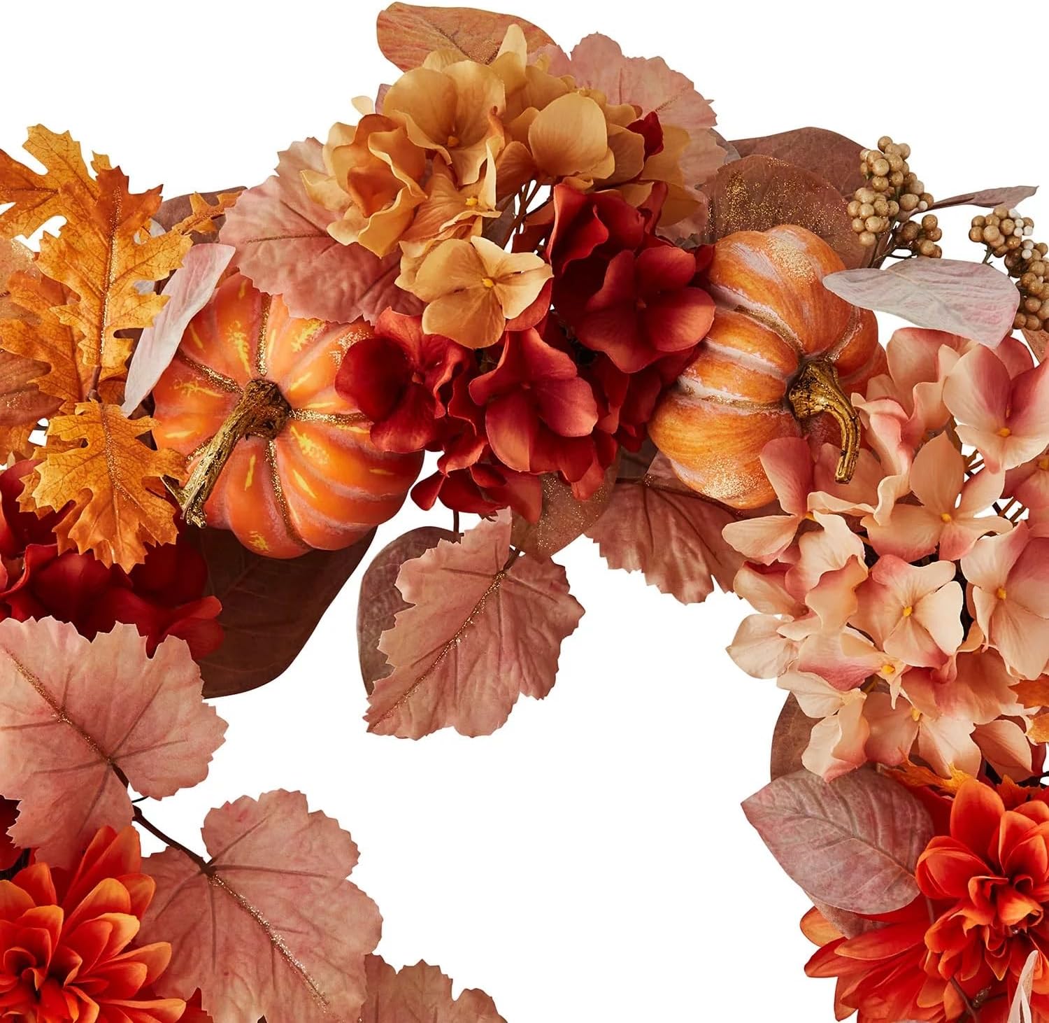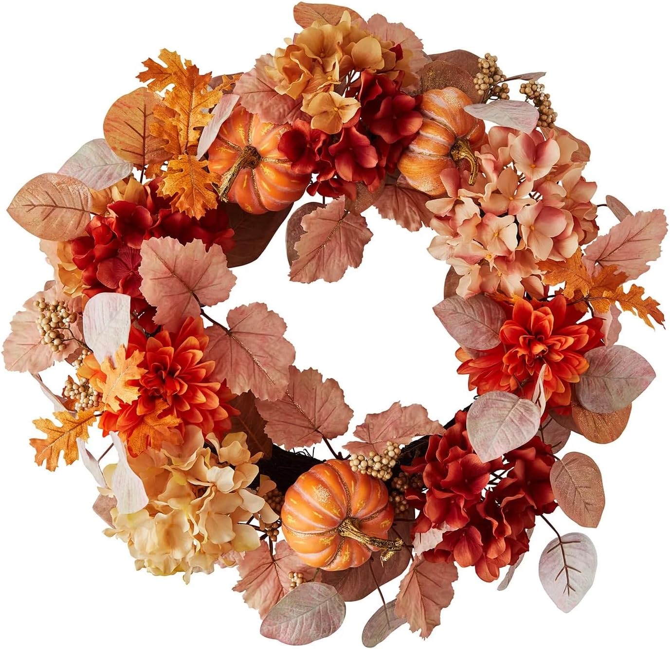La corona de cosecha cuenta con una mezcla de hortensias, dalias y calabazas que resaltan el atractivo del otoño cada año, añadiendo un color cálido a tus celebraciones de temporada y reuniones.