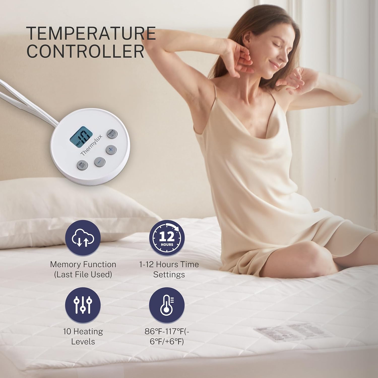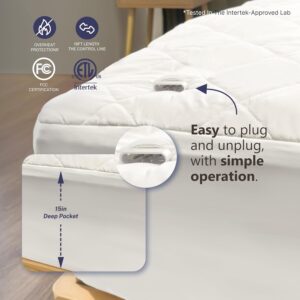 【Certificación de seguridad garantizada】: La funda y el controlador de colchón de Thermylux están certificados por ETL para calidad y seguridad, con protección incorporada contra sobrecalentamiento y cortocircuitos para un uso sin preocupaciones. Para mayor seguridad, recuerda apagar al salir de la habitación.