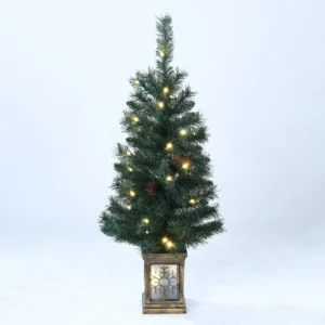 Decora tu porche delantero en minutos con el juego de 5 piezas Holiday Time Pre-Lit Christmas Tree Entryway. Este conjunto completo incluye todo lo necesario para una entrada impresionante: dos árboles de Navidad de 3′, dos guirnaldas de 9′ y una corona de 20″ para su puerta principal. Cada unidad tiene acentos de cono de pino y está pre-encadenado con cálidas luces led blancas que rodean su puerta principal con luz suave y brillante. Los árboles compactos unidad con 90 puntas de ramas para un aspecto realista y se verán impresionantes a ambos lados de la puerta principal o los escalones del porche. El Holiday Time Pre-Lit Christmas Tree Entryway Set es la forma perfecta de dar la bienvenida a familiares y amigos y se puede contar con él para traer la temporada de alegría navideña después de la temporada.