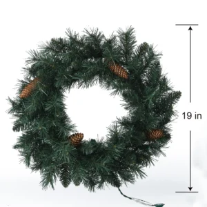 La corona artificial de 20 pulgadas tiene 80 puntas de ramas, 20 mini luces led blancas cálidas y 4 conos de pino.