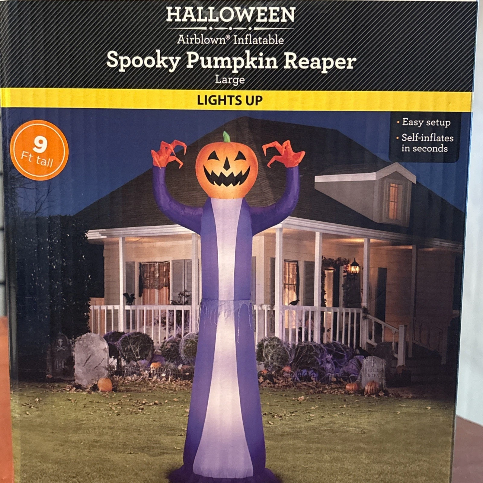 Este producto es un Spooky Pumpkin Reaper inflable de 9 pies diseñado para decorar al aire libre y celebrar Halloween. Hecha por Way to Celebrate y Walmart, esta decoración al aire libre cuenta con un espeluznante personaje segador de calabazas que mide 9 pies de altura cuando se infla y se ilumina. Este inflable soplado por aire seguramente será una adición divertida y llamativa a tus decoraciones de Halloween en los próximos años.