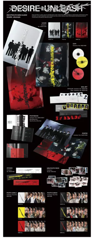 El gigante del K-Pop, ENHYPEN (JUNGWON, HEESEUNG, JAY, JAKE, SUNGHOON, SUNOO y NI-KI), tras su debut en Coachella, abre una nueva etapa con su sexto miniálbum titulado «DESIRE: UNLEASH». Disponible en tres versiones: MAKE, YOU y MINE. Componentes: CD, álbum de fotos (80 págs., 72 págs.), sobre, sello, minifoto (7 unidades), pegatina, póster, tarjeta fotográfica A (1 de 7), tarjeta fotográfica B (1 de 7). Dimensiones: 320 x 240 x 13 mm.