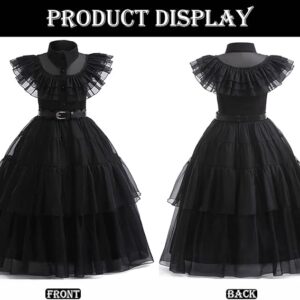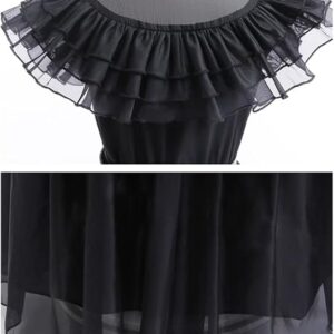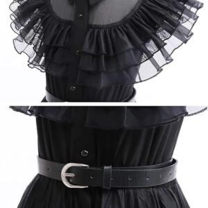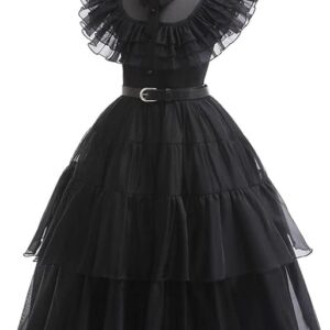 Vestido clásico negro para fiesta de baile. Incluye: un vestido negro + una decoración de cintura + un cinturón + una peluca negra + par de medias negras + dos aretes.