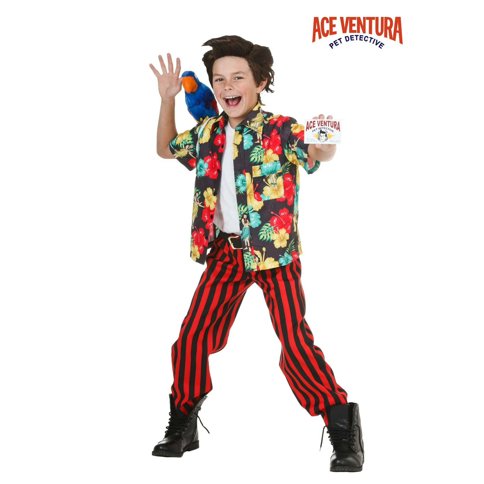 Disfraz de Ace Ventura para niño con cordones de peluca Nuestro exclusivo disfraz de Ace Ventura para niños lleva toda la diversión de las conspiraciones de fútbol y los susurros de animales a un nuevo nivel, ¡deja que tu hijo se vista con el uniforme de ojo privado único de Ace! Nos hemos mantenido lo más fieles posible al aspecto de una de las raquetas de goma más zanier de la película, por lo que podrá divertirse tanto como sea tonto, ya sea que esté tocando el Miami Dolphins o rastreando una nariz de botella real