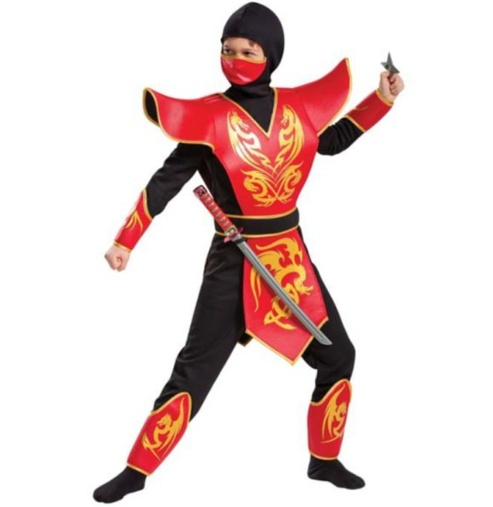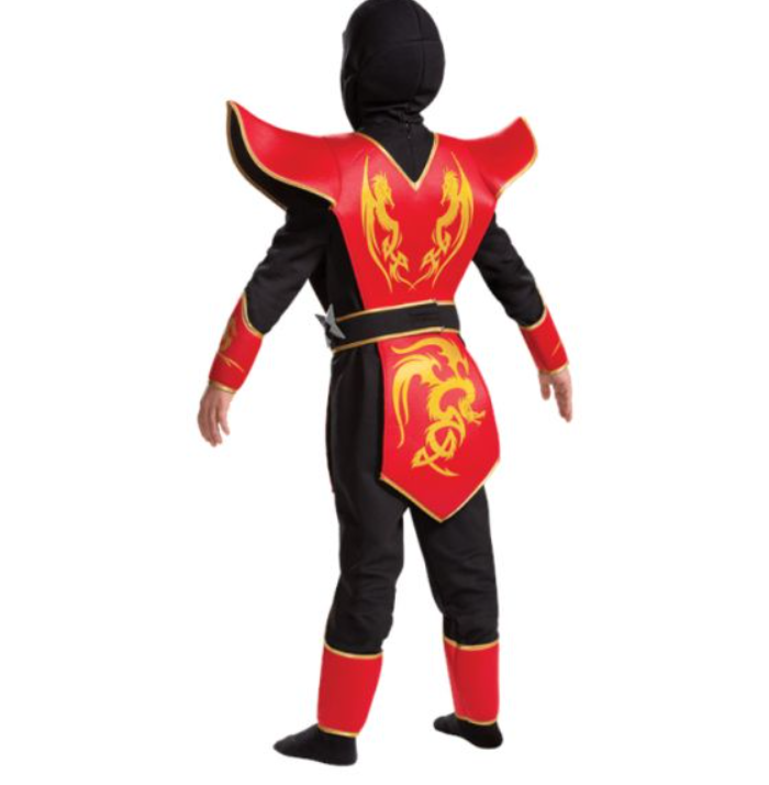 ¡Sé el luchador más elitista con tu disfraz de Ninja Prestige para niños! El disfraz es un mono único que tiene el estilo de una camisa de manga larga negra sólida con una capucha negra a juego. La parte superior es una túnica roja con hombros alados y dragones dorados impresos que se ven absolutamente impresionantes. Una máscara roja hace juego con la túnica, al igual que los protectores de brazos rojos y dorados que se sujetan sobre tus muñecas. Las espinilleras rojas impresas con más dragones dorados protegen tus piernas. ¡Agrega tu confiable estrella arrojadiza y tu katana antes de partir en una misión! Cuenta con tela 100% poliéster, 100% espuma de poliuretano. El mono tiene una cremallera trasera oculta con un gancho y ojal de metal en la parte superior. El mono tiene puños de mangas y puños de pantalones de espuma impresa. La túnica de espuma impresa se sujeta al mono con cierre de velcro en los hombros. El cinturón de espuma tiene un cierre de velcro en la parte posterior. El cinturón tiene presillas para sujetar la estrella arrojadiza y la espada. La capucha/máscara cubre toda la cabeza y la mitad inferior de la cara, dejando los ojos al descubierto. La espada de plástico moldeado mide aproximadamente 22″ de largo. La estrella arrojadiza de plástico mide 3,5″ de ancho.
