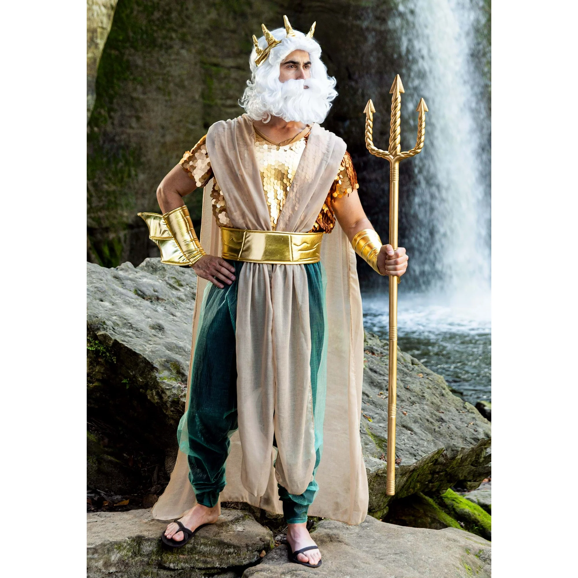 Disfraz de Poseidón de oro para adultos para hombre, mitología griega atuendo de Halloween del dios olímpico Rey del mar Los atuendos divertidos Disfraz de Poseidón para hombre ¿Listo para gobernar el océano? Puedes ascender como el dios griego del mar cuando te deslices en nuestro exclusivo Disfraz de Poseidón para Adultos.