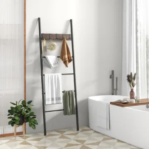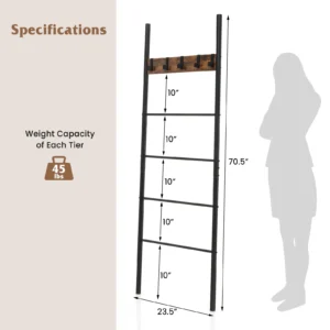 Organice y exhiba sus mantas, toallas, bufandas y más con nuestra escalera de mantas de 5 niveles. Ofrece un diseño que ahorra espacio y es perfecto para habitaciones con espacio limitado. Los ganchos extraíbles de la escalera le permiten colgar sombreros, bolsas o plantas, lo que la convierte en una solución de almacenamiento versátil. Fabricada con un bastidor de metal resistente y tratada con recubrimiento en polvo para evitar la oxidación, nuestra escalera está diseñada para durar. Sus líneas simples y su estilo industrial lo hacen adecuado para cualquier habitación, y es fácil de montar con todos los accesorios necesarios incluidos. Mantenga su espacio ordenado y elegante con esta escalera de almacenamiento práctico con un diseño elegante.