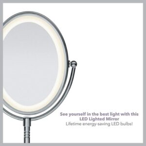 Prepárate para tu primer plano con el espejo de tocador de doble cara con luz LED Reflections de Conair. El elegante diseño delgado de este espejo ovalado iluminado solo se ve eclipsado por las bombillas LED de bajo consumo que iluminan ambos lados. Al consumir menos energía que las bombillas incandescentes, las bombillas LED que funcionan con baterías nunca necesitan reemplazo y se pueden ajustar con el interruptor de ajuste Alto/Bajo en la base del soporte del espejo. Con una vista estándar y un aumento de 7x reflejado en el vidrio ovalado, este espejo se destaca y se entrega para brindarle la mejor vista. Este elegante espejo también cuenta con un acabado de níquel satinado y una rotación de 360 grados para una visualización de doble cara. Prepárate con facilidad con el espejo de tocador de doble cara con luz LED Reflections de Conair.