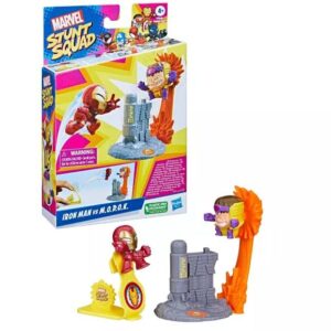 Héroes poderosos, mega actitud! Marvel Stunt Squad Iron Man vs. MODOK Playset es un juego de figuras de acción gamificadas que a los niños les encantará. Con los personajes favoritos de Marvel en un patrón de juego clásico de héroe contra villano, ¡estas figuras de superhéroes a pequeña escala están llenas de poses dinámicas y diversión llena de acción! Marvel Stunt Squad Hero vs. Villain Playsets incluye dos figuras a escala de 1 pulgada, un lanzador y una base objetivo.