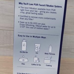 El soporte para grifo de PUR proporciona agua sana, limpia y de excelente sabor directamente de su grifo. Con una instalación sencilla con 1 clic y sin herramientas, una eliminación superior de contaminantes, nunca ha existido una forma más fácil o más confiable de obtener agua PUR. Cada filtro de agua PUR le brinda 100 galones de agua saludable, limpia y de excelente sabor con nuestra exclusiva tecnología MAXION.