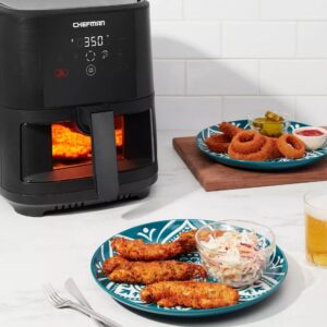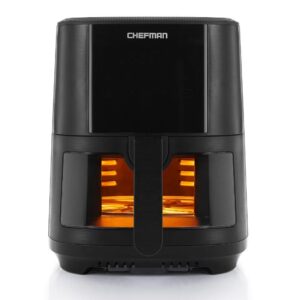 La freidora de aire Chefman TurboTouch es la forma más rápida, saludable y conveniente de cocinar. Con una conveniente ventana de fácil visualización, puede ver cómo se fríe la comida hasta lograr el acabado ideal. Fríe al aire pollo crujiente, pescado fresco, bistec suculento y papas fritas doradas hasta lograr un acabado impecable con poco o nada de aceite.