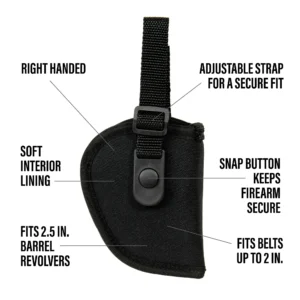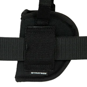 La funda Strategy Small Frame Revolver está hecha de una carcasa exterior resistente laminada sobre un relleno de celda cerrada resistente al agua que proporciona un revestimiento suave y libre de inconvenientes. El material duradero se adapta a la forma de la pistola. La correa de retención ajustable viene con un cierre de presión moldeado duradero. El lazo de correa de banda se adapta a correas de hasta 2 pulgadas de ancho. Esta funda de revólver Strategy Small Frame está diseñada para la colocación de la cadera derecha y se adapta a la mayoría de los revólveres con barriles de hasta 2,5 pulgadas.
