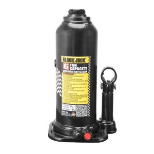 Gato de botella soldado Black Jack de 6 toneladas con tapa de rosca ajustable. Paquete de caja de color. Rango de elevación: 8-1 / 4 «a 15-15 / 16» La botella Black Jack de 6 toneladas es un artículo útil cuando surge la necesidad. Le ayuda a levantar un vehículo para reemplazar una llanta pinchada o para hacer otras reparaciones. Construido de acero resistente, este gato de botella Black Jack tiene una montura dentada y tratada térmicamente para un agarre firme y confiable. El tornillo de extensión también está diseñado para lograr una altura de elevación adicional y una altura de recogida más baja para mayor comodidad. Este gato de botella para automóvil tiene un tamaño compacto que facilita su almacenamiento.