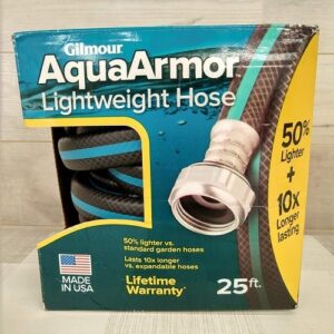 - La manguera liviana Gilmour® AquaArmor ™ es 50% más liviana que las mangueras estándar y dura hasta 10 veces más que las mangueras expandibles