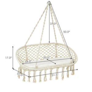 ● Cojín grueso y suave: Diseñada con un amplio cojín de asiento con acolchado grueso de algodón, esta hamaca ofrece una experiencia cómoda para un mayor disfrute. Para tu comodidad, la funda del cojín es desmontable para facilitar su limpieza. ● Uso en interiores y exteriores: La hamaca columpio presenta un diseño de red de macramé con borlas de flecos, creando un ambiente bohemio y exótico. Es el complemento perfecto para decorar tu sala de estar, jardín, balcón y más. Además, su diseño ligero y plegable te permite moverla fácilmente a donde quieras.