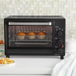 Este horno tostador Mainstays XL viene con 3 funciones: tostar, hornear y asar con una potencia de salida de 1500 W. El diseño clásico de control mecánico de 3 perillas en negro mate complementa cada estilo de cocina y la hace muy fácil de usar. La cavidad y los accesorios de fácil limpieza hacen que tu limpieza sea mucho más temprana. Su espaciosa capacidad interior de pizza de 6 rebanadas/12 pulgadas satisface las necesidades diarias de cocina familiar. Una cocción uniforme se consigue con sus elementos calefactores superiores e inferiores. La temperatura se puede ajustar de 100 a 450 grados Fahrenheit por hasta 60 minutos. Las posiciones versátiles de las parrillas brindan flexibilidad para cocinar diferentes tipos de alimentos, como asar papas, calentar pizza, tostar pan, asar alitas de pollo y hornear pasteles y galletas, etc. Una bandeja recogemigas extraíble es fácil de limpiar. Los accesorios incluyen una bandeja para hornear y una parrilla.