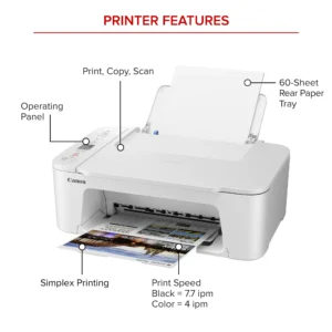 Diseñada para el uso doméstico, la impresora de inyección de tinta todo en uno PIXMA TS3722 de Canon ofrece una impresión de alta calidad y una conectividad inalámbrica excepcional en un tamaño compacto. El PIXMA TS3722 es fácil de configurar y mantener y ofrece una gran versatilidad de medios para imprimir en una variedad de tipos y tamaños de medios, incluidos papel fotográfico, sobres, fotos sin bordes, banners y más. Utilice PosterArtist Online para crear carteles profesionales, banners y señalización. Imprima documentos y fotos en una variedad de tipos de papel utilizando un sistema de tinta híbrido con pigmento negro para texto negro nítido y colores basados en tintes para fotos vívidas de hasta 8.5 «x 14». Produzca documentos y fotos nítidos y coloridos de forma rápida y rentable con velocidades de impresión rápidas y un sistema de tinta híbrido FINE de 2 cartuchos de alta calidad. Mantenga la impresión con una capacidad de papel normal de hasta 60 hojas en la bandeja de papel trasera. Conecta e imprime fácilmente a través de USB de alta velocidad o de forma inalámbrica desde ordenadores o dispositivos móviles, e imprime fácilmente desde tus dispositivos móviles compatibles con la aplicación gratuita Canon PRINT y mucho más.