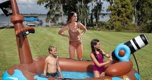 El canon también dispara agua, y todo lo que tienes que hacer para comenzar a derribar las flotas enemigas es conectarle una manguera. Con casi 6 pies de largo, la piscina puede albergar hasta tres personas: ¡simplemente colóquela en el césped o en un suelo blando, tome la manguera de su jardín y no deje que nadie pase sin rociarse!