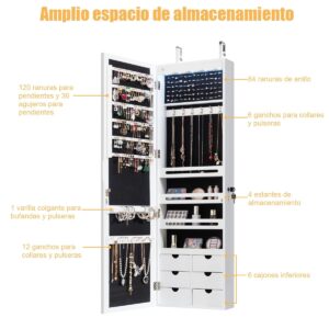 Amplio espacio de almacenamiento:Este gabinete de joyería cuenta con un riel para ropa, 18 ganchos para el cuello, 84 ranuras para anillos, 4 compartimentos abiertos, 6 cajones, 120 ranuras para pendientes, que brindan mucho espacio de almacenamiento para todos sus accesorios de joyería.