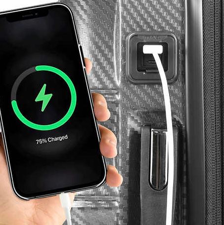 - Puerto USB-C y bolsillo para batería externa en el equipaje de mano para cargar sus dispositivos mientras viaja