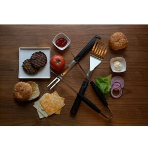 - Dimensiones: Espátula 40,6 L cm x 7,35 W cm, Tenedor 38,1 L cm x 3,29 W cm y Pinzas 37,6 L cm x 3,29 W cm