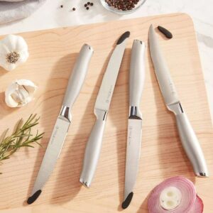 Este juego de cuchillos para carne modernista de 4 piezas mejora su experiencia gastronómica. Este juego de cuchillos incluye cuatro cuchillos para carne de 4,5 pulgadas, perfectos para cortar chuletas de cerdo, filet mignon y chuletas de pollo con facilidad. Hermosa y práctica, la línea de cubiertos Modernist presenta una construcción de refuerzo completamente forjada que pasa sin problemas de la hoja al mango para brindar durabilidad, equilibrio y un diseño llamativo. Fabricada con acero inoxidable alemán de alta calidad, la hoja con acabado satinado de este juego de cuchillos para carne produce cortes de precisión y está afilada para un filo duradero. El mango hueco de acero inoxidable, igualmente ergonómico y elegante, es maravillosamente ligero. Su textura arenada a prueba de huellas dactilares es fácil de agarrar y tiene un hermoso acabado con un extremo pulido con el logotipo en relieve. Disfrute de cortar y limpiar sin esfuerzo con estos cuchillos aptos para lavavajillas.